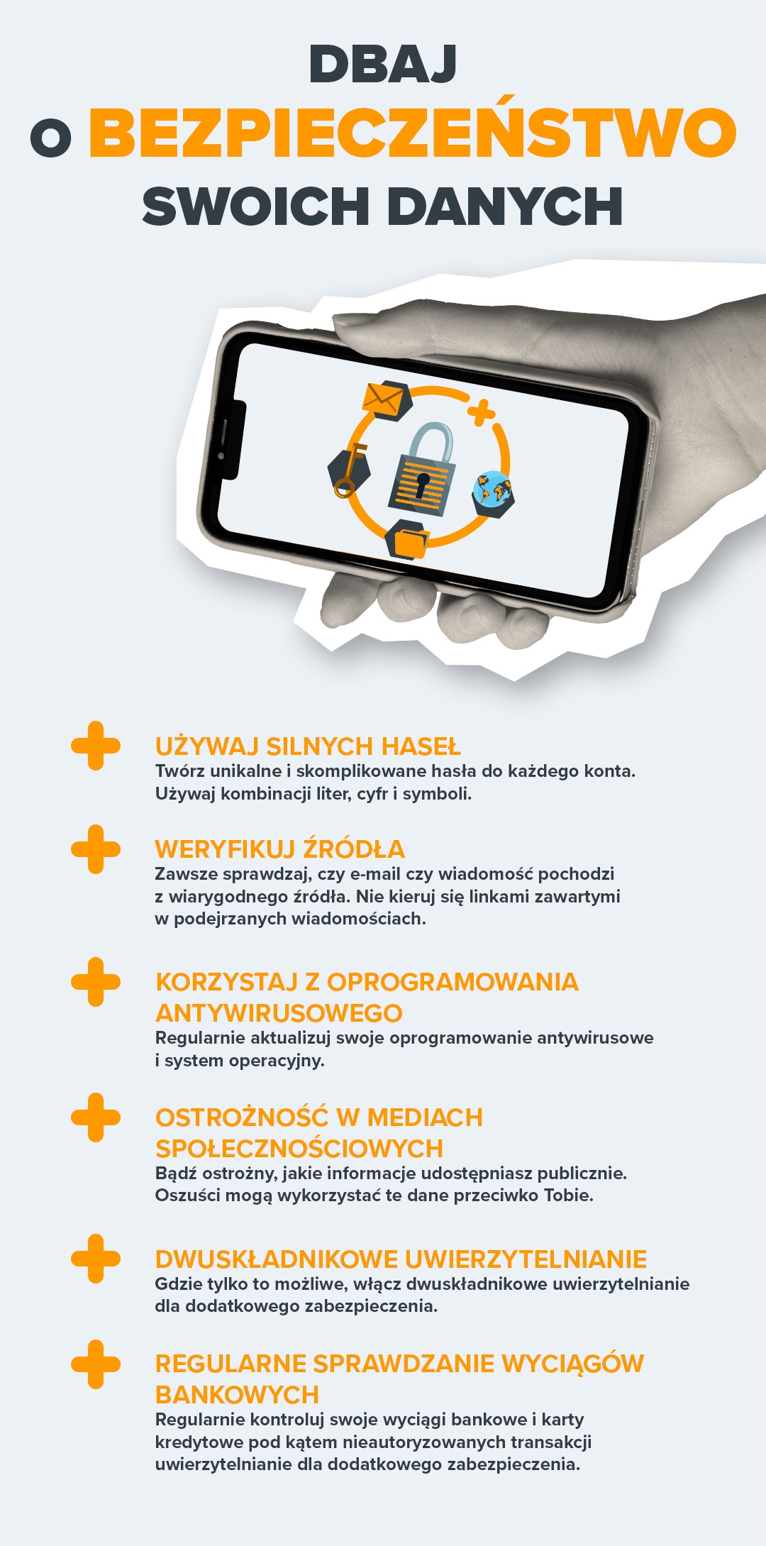 Ręka trzymająca telefon z ikoną kłódki i symbolami bezpieczeństwa oraz hasło "Dbaj o bezpieczeństwo swoich danych!"