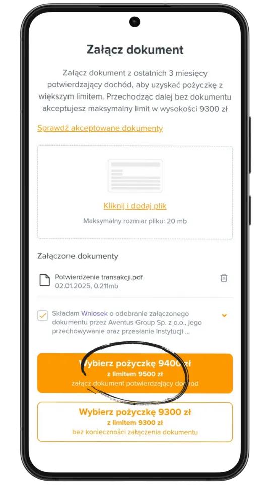 UWAGA! Dokumenty potwierdzające wysokość Twoich dochodów możesz załączyć jeszcze przed złożeniem wniosku o pożyczkę w wyższej kwocie, dzięki czemu w przyszłości proces aplikacji przebiegnie sprawniej. Możesz to zrobić logując się do swojego profilu w strefie klienta i wchodząc w zakładkę “Dane osobowe”. Dodanie dokumentu jest bardzo proste zarówno na telefonie, jak i na komputerze.